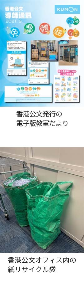 ある研究によると、毎年伐採されている170億立方フィート(4.8億m3)の木のうち、60%以上が製紙に使われています。そこで私たちは、森林伐採を減らすために、ドキュメントのオンライン共有や教室だよりの電子発行、電子入会システムを利用するなど、職場のペーパレス化を進める最大限の努力をしてきました。広東公文の深セン支局では社員が一丸となり、2020年第1四半期に900枚だった紙の使用量を、2021年第1四半期には310枚へと、590枚も削減することができました。