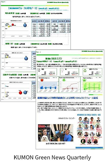 「KUMON Green News Quarterly」では、四半期ごとの地域別環境データを掲載するとともに、各グループ会社から環境活動を報告してもらい、 KUMONグループ全体で情報を共有しています。
