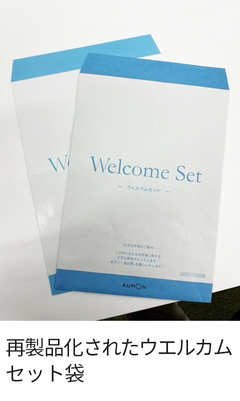 また、教材改訂の際には大量の旧教材が発生しますが、2022年度は旧教材の再製品化に取り組みました。同年度に教材改訂のあった国語については、旧教材を回収し、入会希望の際にお渡しするパンフレット等を封入するウェルカムセット袋に再製品化することができました。引き続き教材のリサイクルに取り組んでいきます。