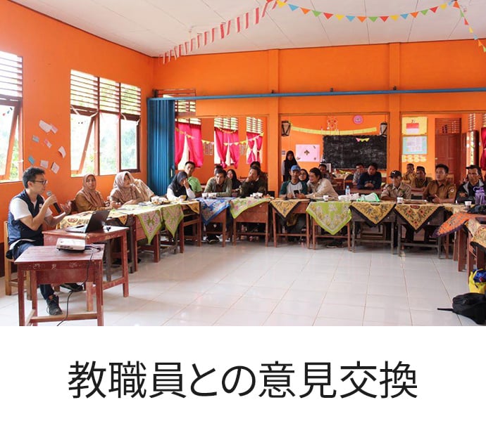 また、メラウィ県のナンガ・ケベブ村、セマディン・レンコン村の中学校2校で、ESD活動を開始しました。インドネシアの教育政策では、地域の特徴に沿ったカリキュラムで教育をすることを推進しています。WWFでは、中学校2校の教職員に、ESDの基礎を説明し、地域のカリキュラム策定支援を行いました。