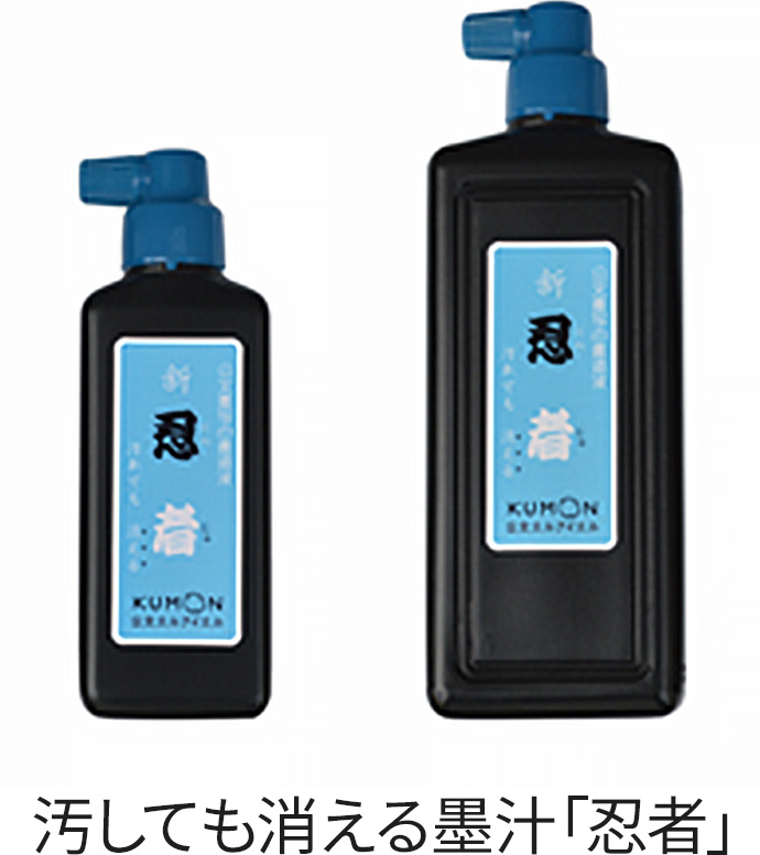 公文エルアイエルでは、「汚しても消える墨汁(忍者)」を独自開発しました。紀元前から存在していたと言われる墨の特長には、「消えることなく後世に残すことができる」という価値があります。しかし、公文書写においては未就学児でも始められる毛筆教材を開発するとともに、「汚しても消える墨(忍者)」を開発して、書写学習で活用しています。「忍者」はでんぷん由来の成分で作られた墨汁で、専用の色消し液を用いると墨液汚れを落とすことができます。