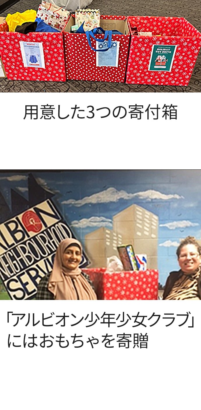 これらの寄付により、ブランプトンを拠点とするフードバンク「リージェン・アウトリーチ・コミュニティ」には80ポンドもの食料を、低所得世帯を支援する「アルビオン少年少女クラブ」にはおもちゃを寄贈できました。また、毎年恒例のアソシエイト・ホリデー・ポットラックの際に、「子供朝食クラブ」を支援するための、コートと冬物必需品の寄付を企画し、100着以上のコートを寄贈することができました。