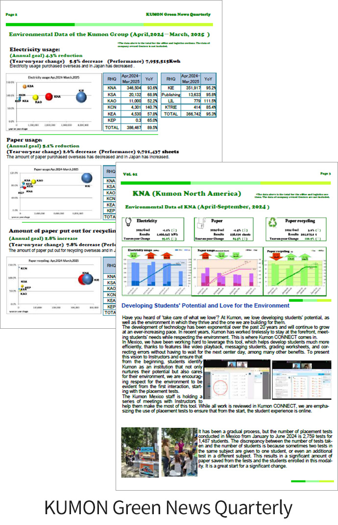 「KUMON Green News Quarterly」では、四半期ごとの地域別環境データを掲載するとともに、各グループ会社から環境活動を報告してもらい、 KUMONグループ全体で情報を共有しています。