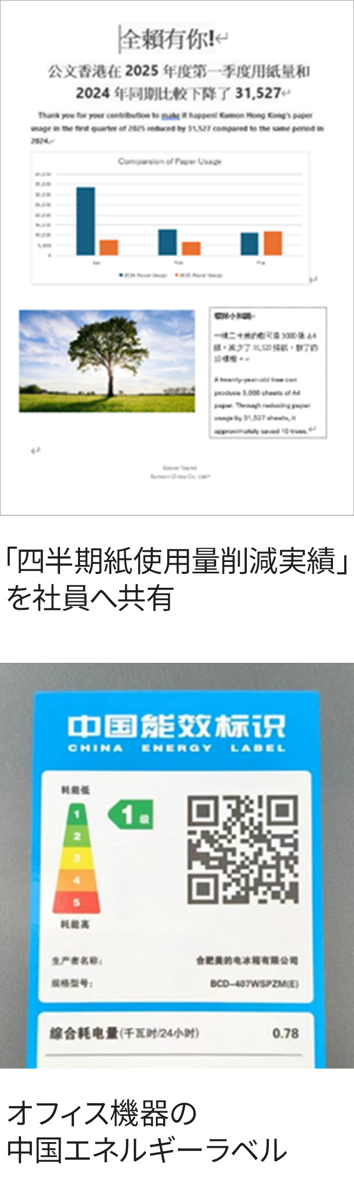 香港オフィスでは、2024年第2四半期から第3四半期にかけて紙の使用量が19.5%減少しました。また、北京オフィスでも25%減少したほか、2025年第1四半期には香港公文の紙使用量が前年同期比で約54.4%削減されるなど、大幅な紙資源節約を達成しています。社内文書の電子化や、印刷前に再考を促すポスターの掲示は、社員の意識改善にもつながり、環境負荷の軽減に大きく貢献しています。