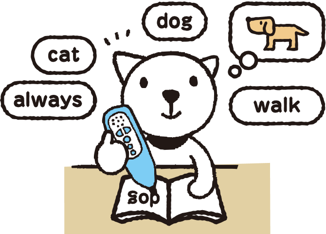 E-Pencilを使い、教材の英語を聞いてからまねして言います。音と文章やイラストのイメージを一致させ、「言葉」としての 英語の習得につなげます。「聞く」「読む」力を身につけます。