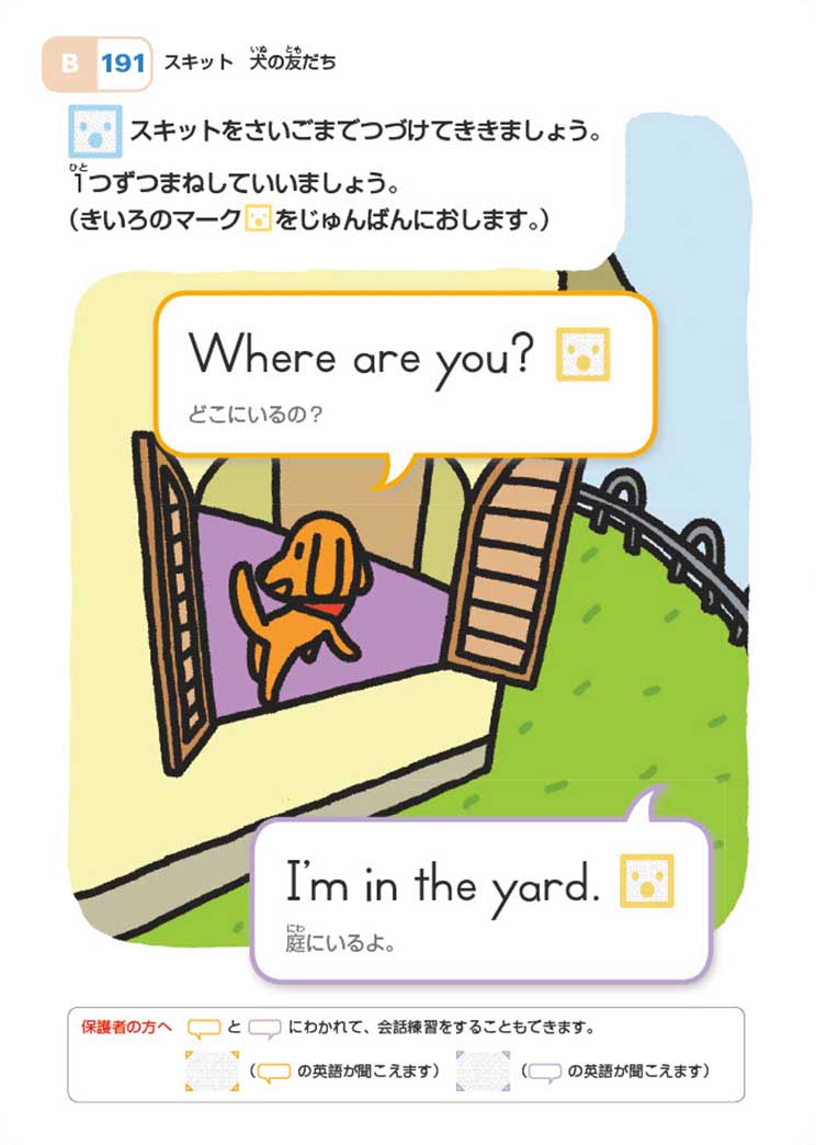 イラストと英語を見ながら一緒に発音したり、歌ったり・・自然と楽しく英語の世界に親しめます。日常的な表現を通して、わかる英語を増やしていきます。