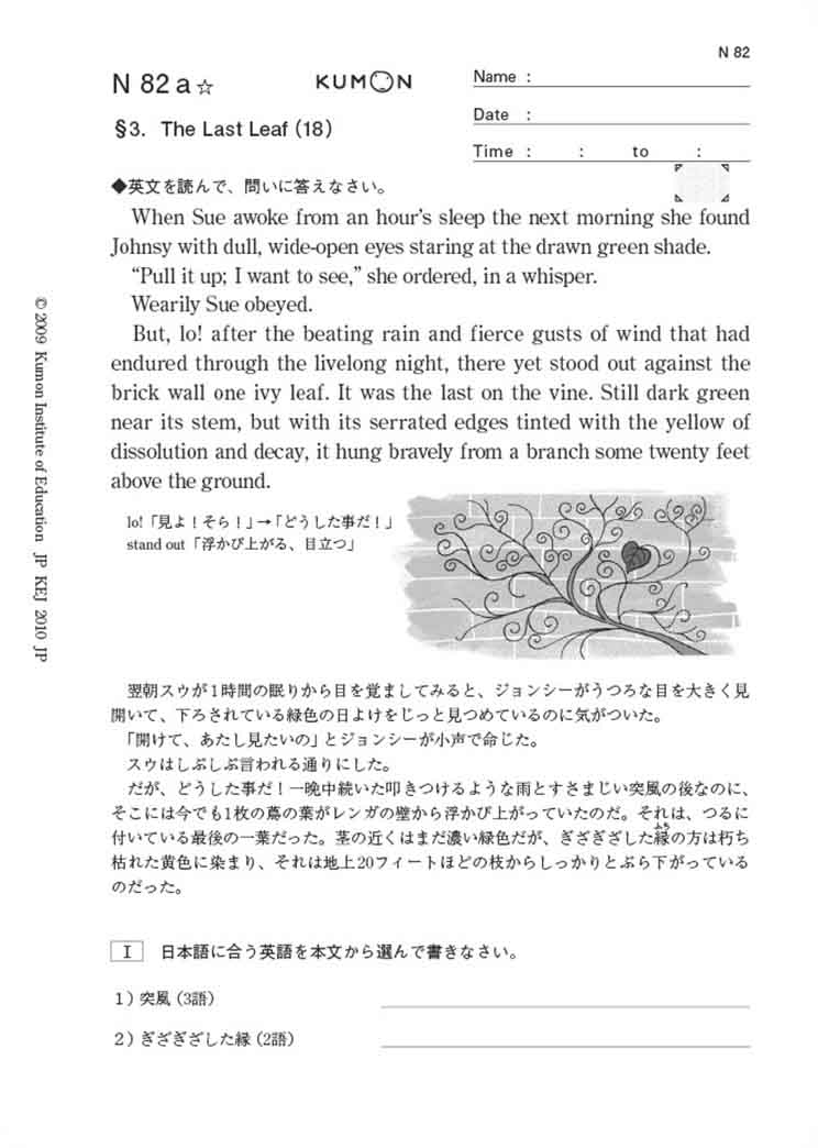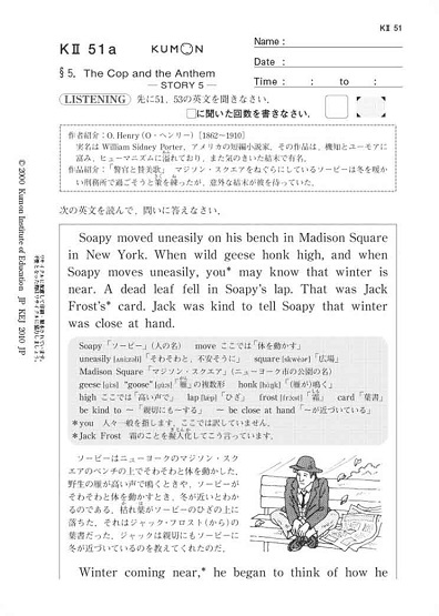 KUMONの英語教材は、語彙力や文法力を身につけながら、読み物を中心に、できるだけ多くの英文を対訳形式で読み進めていきます。ストーリーの面白さを味わいながら、英文の中で生きた文章表現や文法に触れていくので、知らず知らずのうちに長文読解力が身についていきます。長文読解力が高い比重を占める高校入試や大学入試でも、だんぜん威力を発揮します。