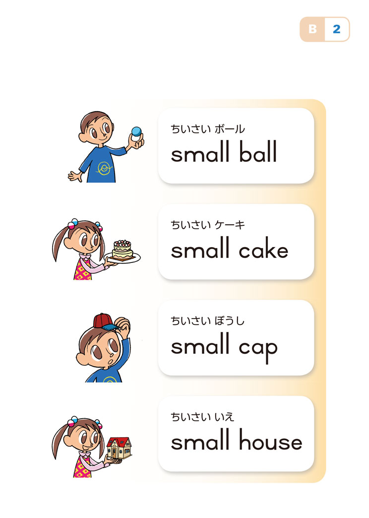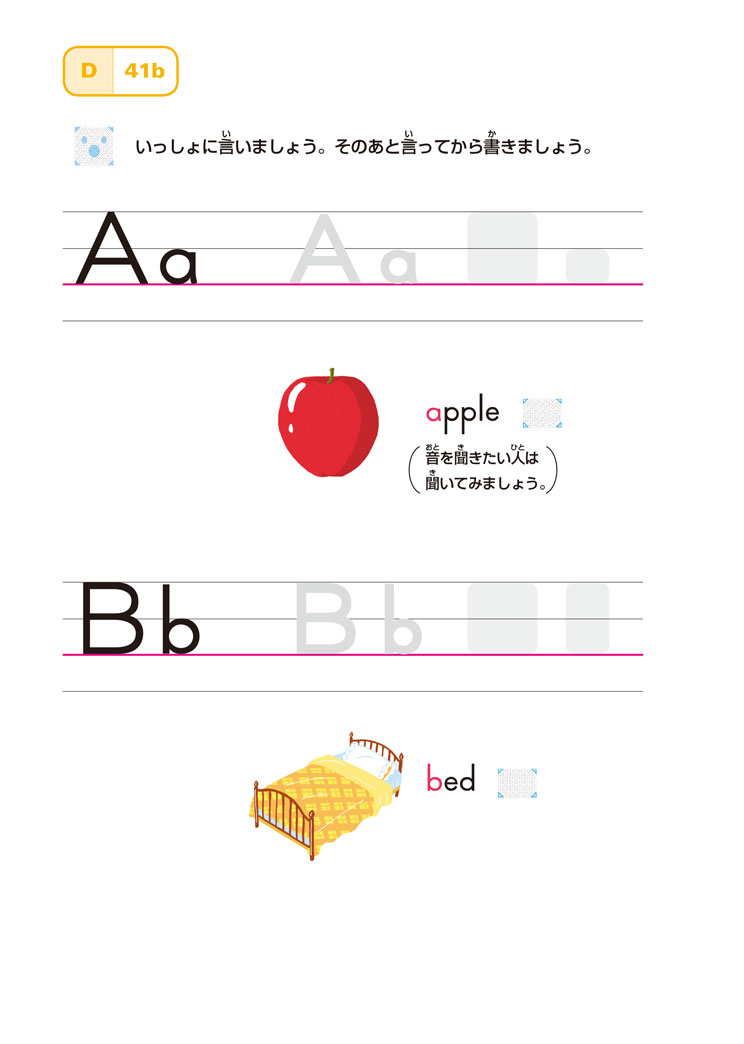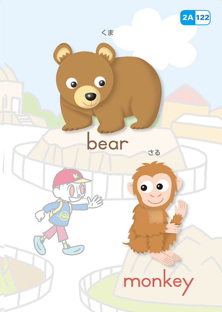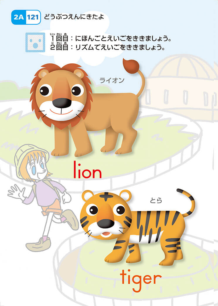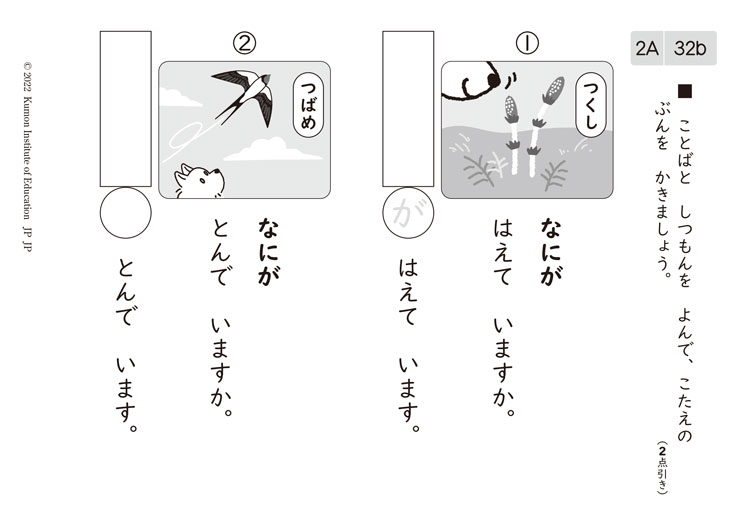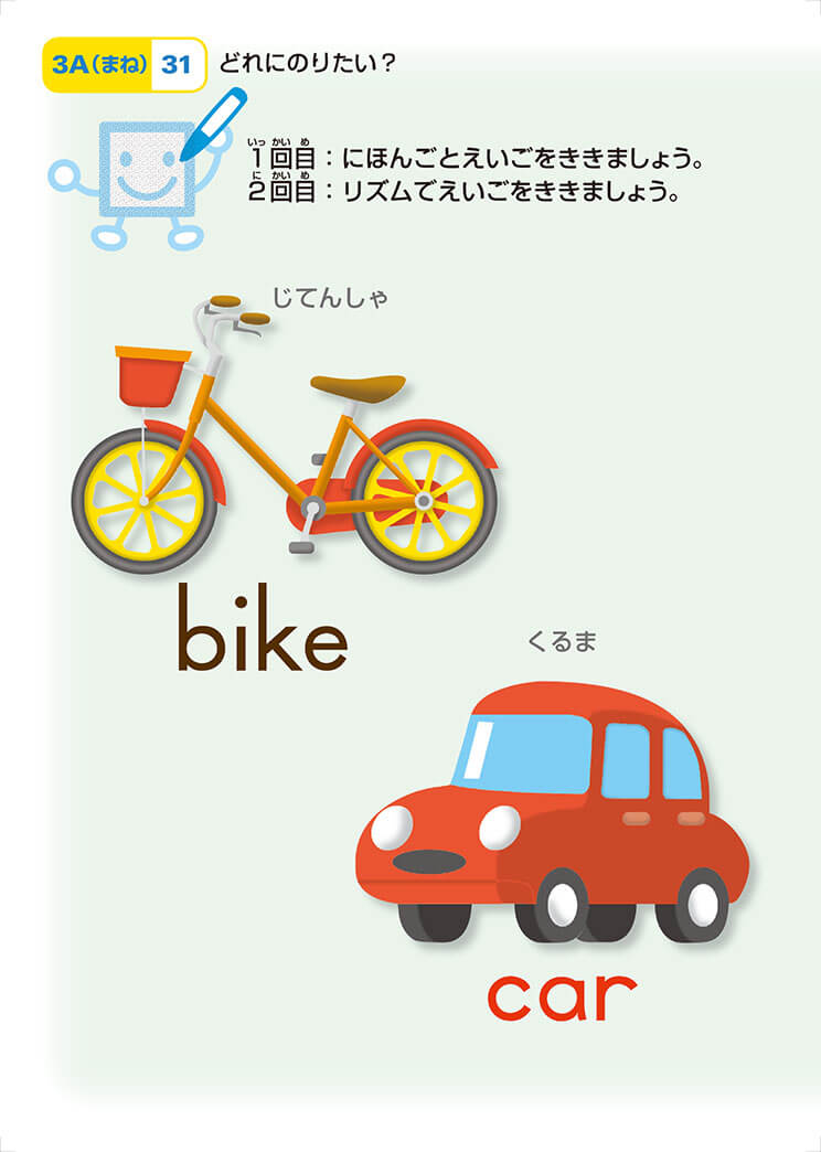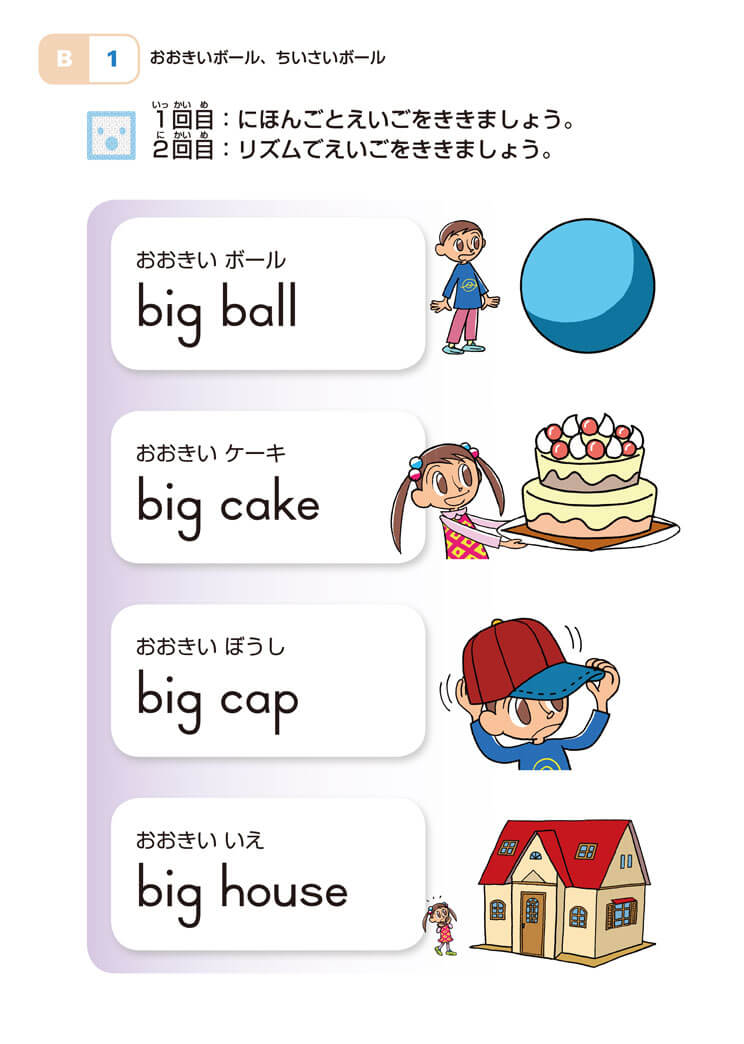 例えば「さんすう」教材は、教材の絵を指さして、読むこと、数えることからはじまります。そして、1~10まで、~20まで…と、数唱や数える力をまず伸ばしてから「たす1」へと進んでいきます。「こくご」教材では、新しい文字や言葉が、次々に出てきます。読む力、語彙の力を十分つけながら、書くことや文の練習へと進みます。