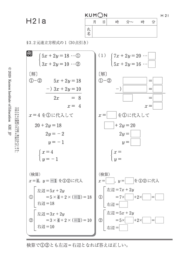 KUMONでは、中学・高校に行っても困らないだけの基礎学力を自学自習で身につけることを目指しています。わかるところ、わからないところや問題を解くのにかかる時間などを考慮して、個人別にちょうどよい内容と分量の学習から始めていきます。
