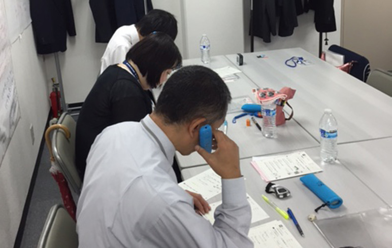 英語 E-Pencilを使っての学習風景これは公文式教室ではおなじみのE-Pencilを使った英語学習ですが、 でらいとわーくでの英語学習で、意外な効用があることがわかりました。それは“電話を受けながら、メモをとる態勢と習慣づくり”です。 たしかに、電話を受けている姿に重なりますね。
