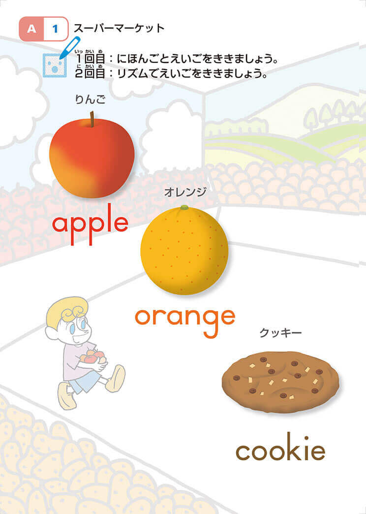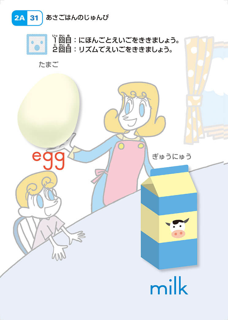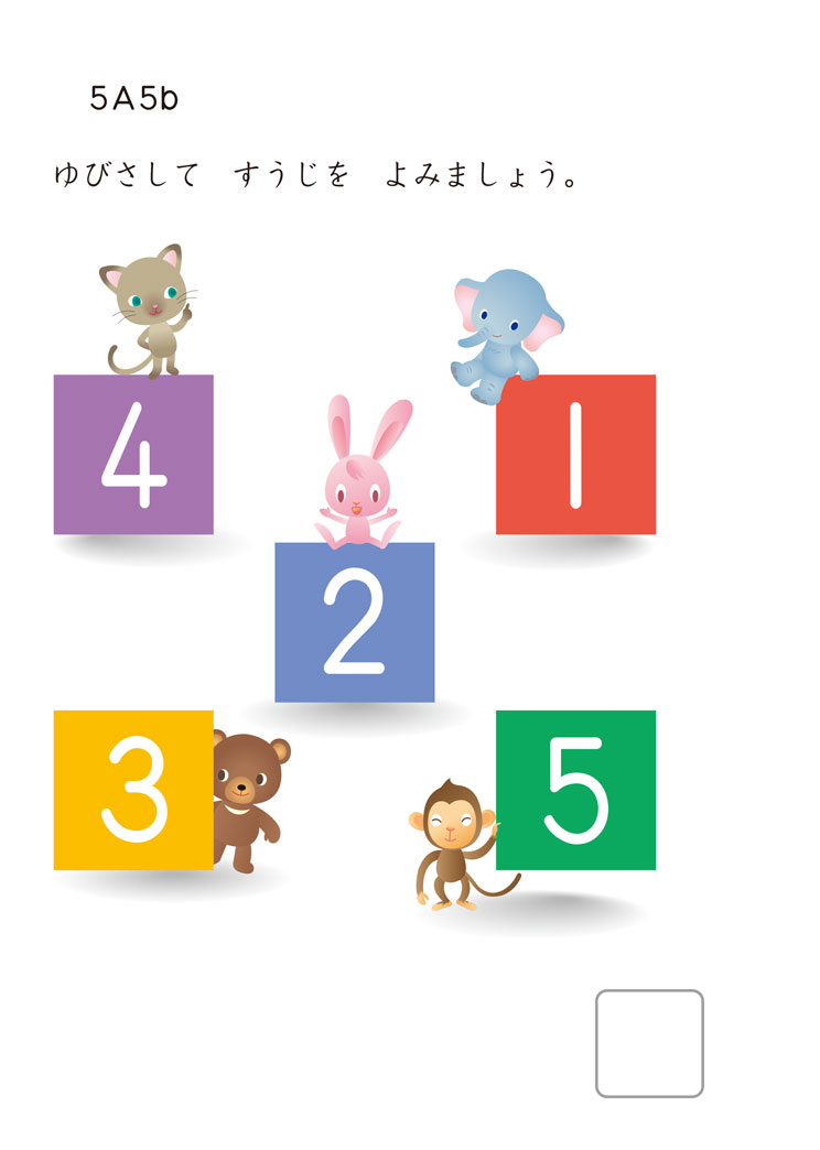 例えば「さんすう」教材は、教材の絵を指さして、読むこと、数えることからはじまります。そして、1~10まで、~20まで…と、数唱や数える力をまず伸ばしてから「たす1」へと進んでいきます。「こくご」教材では、新しい文字や言葉が、次々に出てきます。読む力、語彙の力を十分つけながら、書くことや文の練習へと進みます。