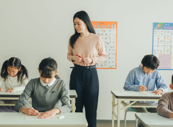 先生の仕事内容のメインは算数・数学、英語、国語の3教科の学習を通じて、子どもたちの成長をサポートすること。一斉授業は行わず、「自学自習」形式で子どもたち自身の力を引き出し、一人ひとりの「やる気」を育みます。