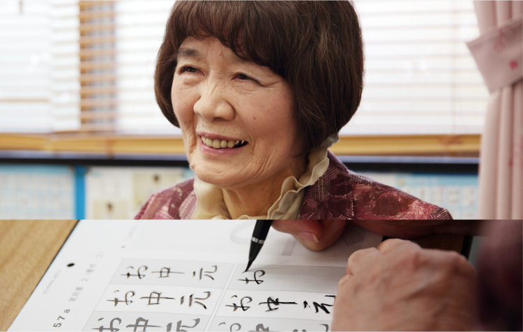 公文書写の教室に通い始めたのは75歳の頃。ちょうど大病を患った直後で、療養のために、時間を持て余す毎日を過ごしていました。そんな時ご近所で「公文書写」ののぼりを見つけたんです。それで、エプロン姿のまま教室にお邪魔して筆ペン教材を体験させてもらいました。すると、思いがけず書く楽しさにはまってしまって!それ以来「毎日4枚」と決めて宿題のプリントをコツコツ学習しています。気づけば4年半で7,000枚にもなっていたんですよ。筆ペンだって、もう何本使ってきたことか。だけど、教材も筆ペンも、全部捨てずに残しています。自分が一生懸命書いたものを、そう簡単にポイッとは捨てられませんよ。