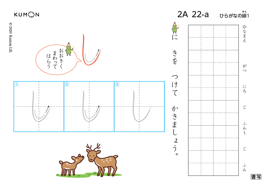 - 書く時の姿勢や鉛筆の持ち方を始め、文字の基本である線の書き方から、整った文字・文章が書けるようにステップアップしながら学習できます。