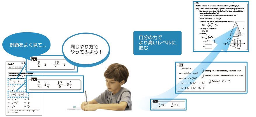 自分の学年を越えて未知の内容に進む時、例題を読み取ることで、子ども達は自分の力で新しい課題に取り組みます。これまで学んできた知識を組み合わせながら、より高いレベルに進んだ時にも自分の力で例題を読み取って、問題を解いていきます。